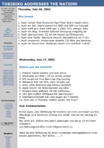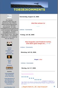 2001: mein Gott! weniger Talent, mit html (1, 2?) umzugehen gab es selten. Gott sei Dank kam dann Blogger (ich habe den Hoodie mit Stolz getragen, den ich zur Googleübernahme geschenkt bekam) und dann – thanks to threema – konnte ich Stück für Stück meinen Ideen eine Heimat geben, die weniger und weniger peinlicher wurde…